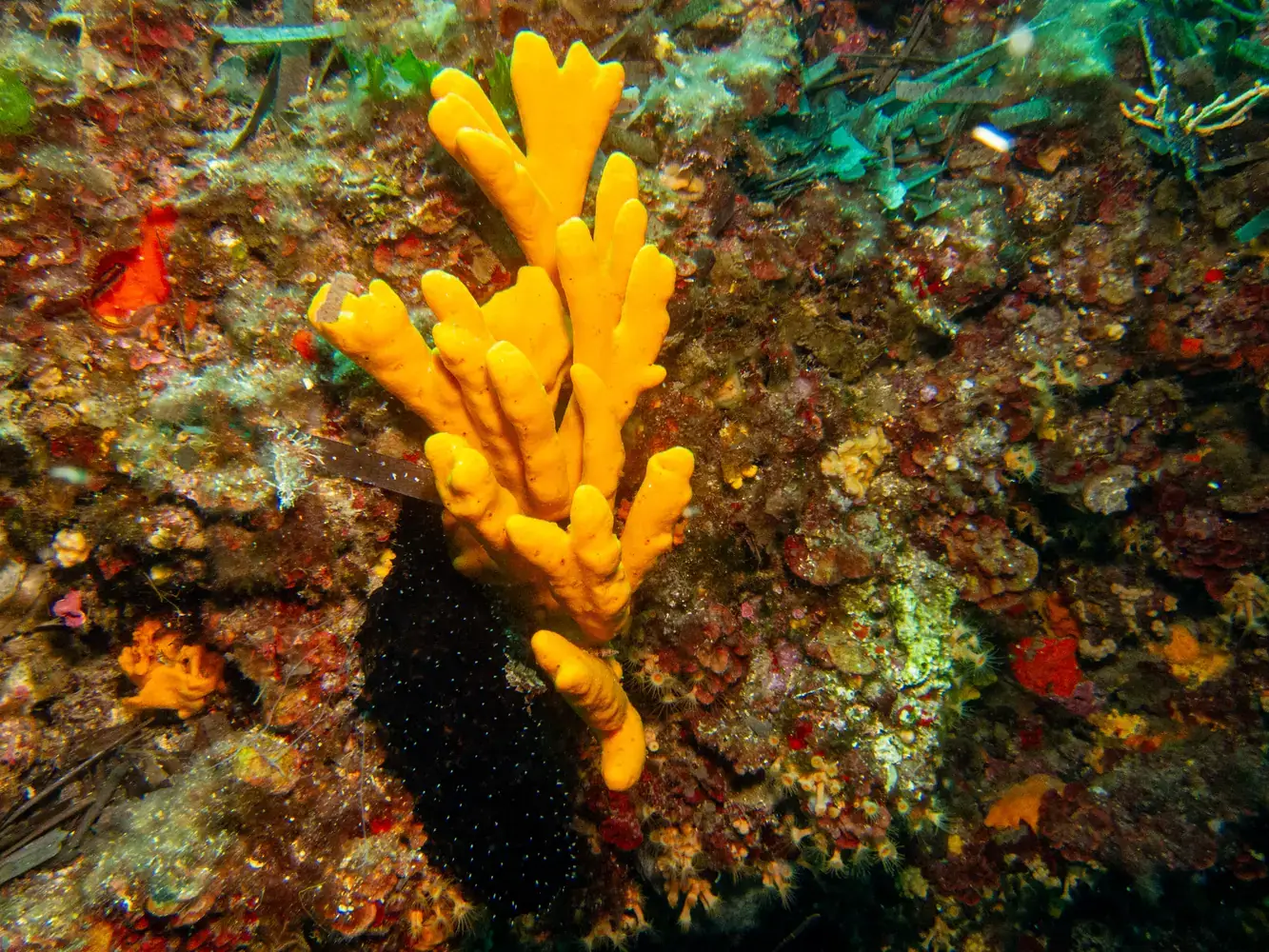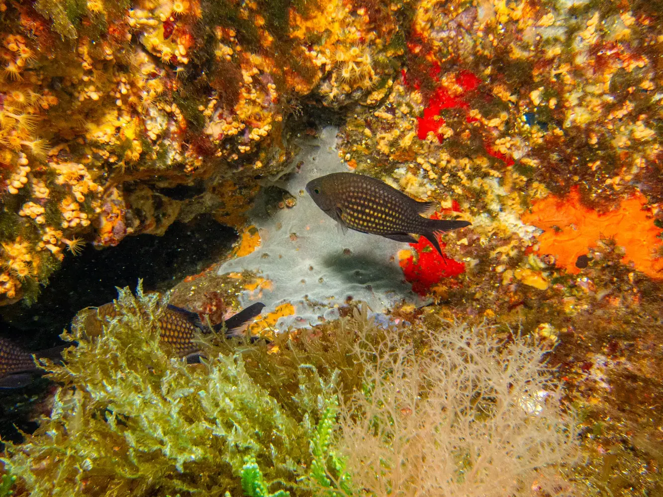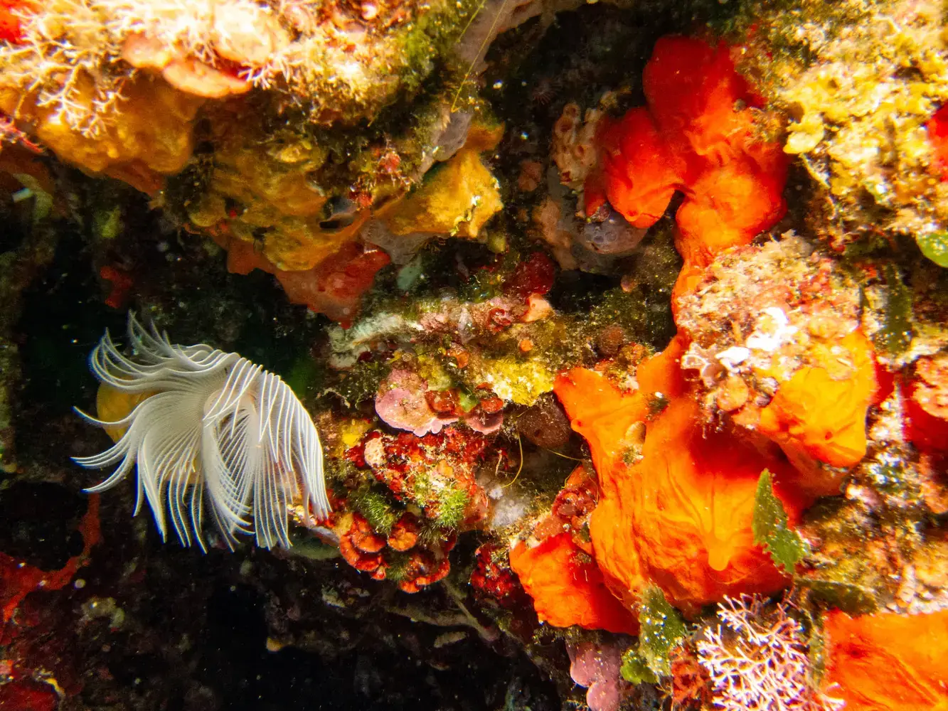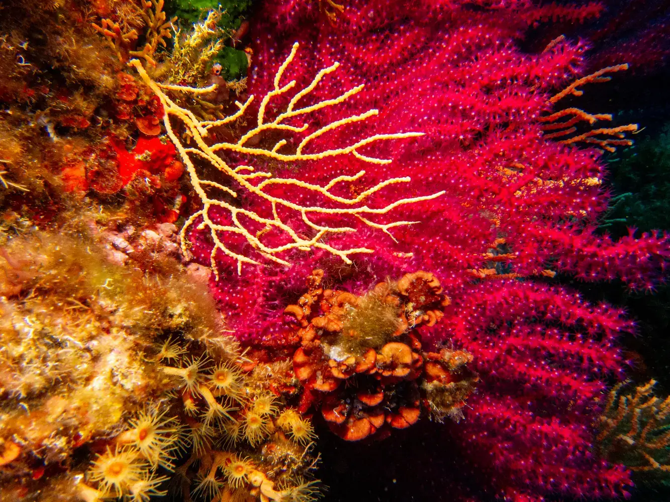 • Vie fixée : Gorgones rouges et blanches, corail, éponges. Les herbiers de posidonie, véritables « forêts » sous-marines, sont omniprésents et essentiels à l’écosystème.